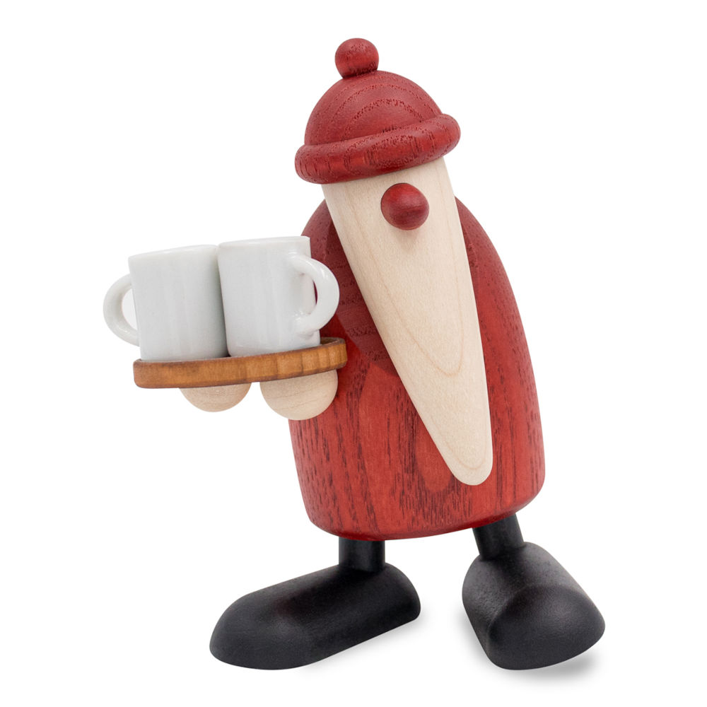 Der Weihnachtsmann als Glühweinkellner ist in meisterhafter Handarbeit handgedrechselt aus Ahorn- und Eschenholz.Die drei Glühweintassen aus echtem Freiberger Porzellan werden auf einem aus gedämpftem Buchenholz gedrechelten Tablett serviert. Ein unikates Stück Erzgebirgischen Kunsthandwerks®.