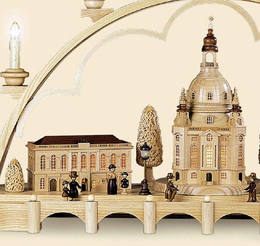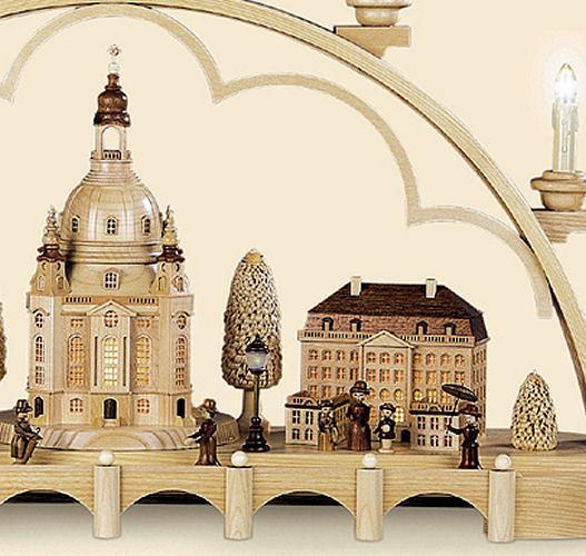 Das historische Dresden in Miniatur für ihr Wohnzimmer! Die elegante Frauenkirche bildet den Mittelpunkt der dargestellten Szene. Originalgetreu abgebildet stehen rechts das spätbarocke Coselpalais und links das Johanneum. Auf dem Neumarkt gehen Figuren in historischen Gewändern spazieren, welche aus exotischen Hölzern bestehen und mit ihren Maserungen charaktergebend sind. Die aufwendig, handgedrechselten Laubbäume im Hintergrund runden das Bild gelungen ab. Im Glanze der elektrischen Kerzen (230V) erhellt dieser Schwibbogen das ganze Jahr über Ihr Heim!