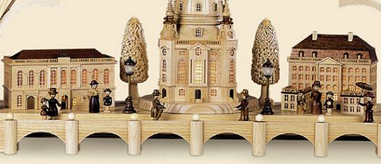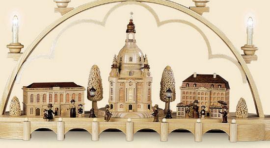 Schwibbögen aus der Manufaktur Müller Kleinkunst sind exclusive und mit vielen interessanten Details versehene Kostbarkeiten mit Anspruch und bleibendem Wert. Typisch für die Schwibbögen der Firma Müller ist das geschützte Wolkenmotiv. Der Schwibbogen Alt Dresden mit der Frauenkirche und den Häusern des Neumarktes strahlt entsprechend dem Motiv eine festliche Atmosphäre aus .