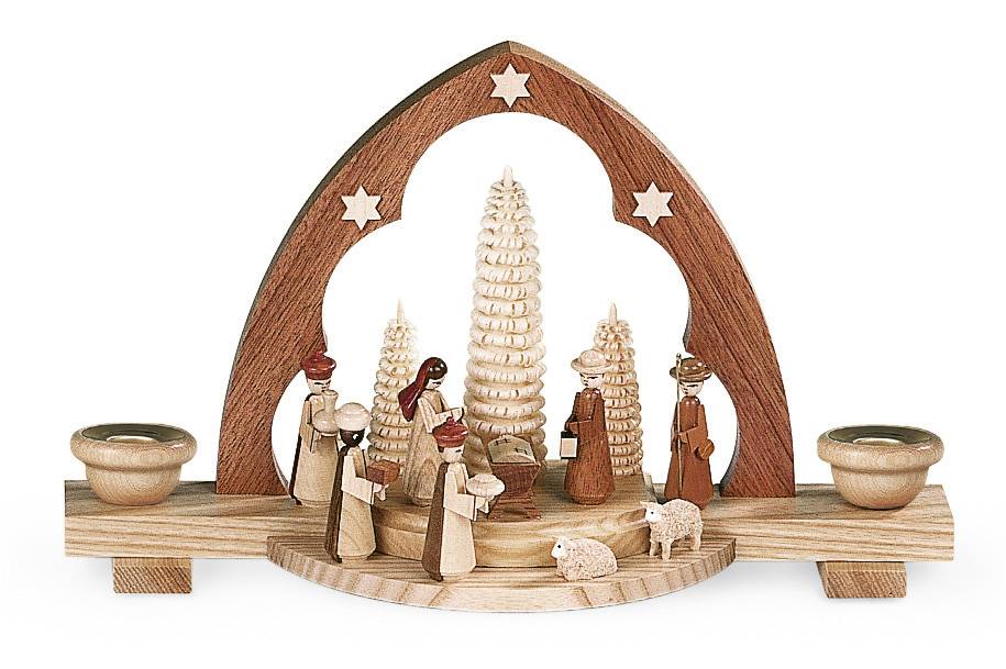 Schwibbögen aus der Manufaktur Müller Kleinkunst sind exclusive und mit vielen interessanten Details versehene Kostbarkeiten mit Anspruch und bleibendem Wert. Typisch für die Schwibbögen der Firma Müller ist das geschützte Wolkenmotiv. Der Spitzbogen mit dem Motiv Christi Geburt mit Maria und Josef an der Krippe schafft eine festliche Atmosphäre,welche besonders durch das warme Licht der Wachskerzen entsteht.