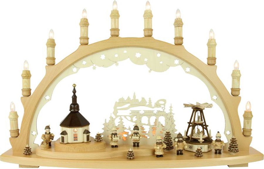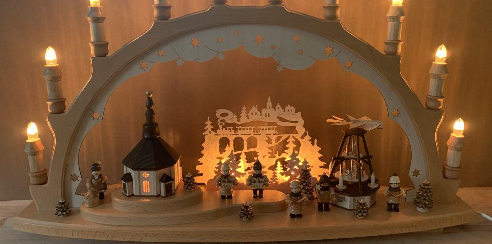 Dieser Schwibbogen wird in der Manufaktur Lenk & Sohn in meisterhafter Handarbeit gefertigt. Das Material ist Massivholz Buche. Die Seiffener Kirche ist innenbeleuchtet. Das Besondere an den Schwibbögen aus der Manufaktur Lenk & Sohn sind die gedrechselten Kerzenschäfte.