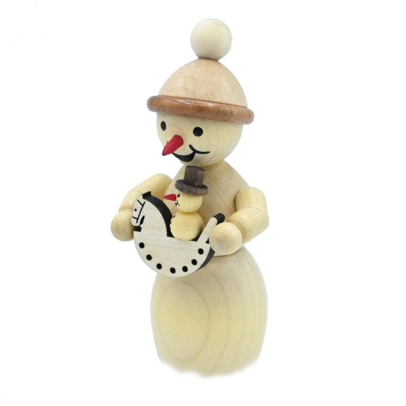 Die Neuheit 2025: Die Schneefrau Spielzeugverkäuferin besteht aus 3 Kugeln. Sie präsentiert stolz das wunderschöne Schaukelpferd mit dem Mini-Schneemann zur Weihnachtszeit.