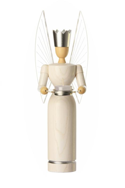 Der wunderschöne elektrisch beleuchtete Lichterengel ist aus Eschenholz in meisterhafter Handarbeit gedrechselt. Er ist weiss lasiert und wirkt durch die in Silber gehatenen Krone besonders edel. Die tranparenten Flügel sind LED beleuchtet. In den beiden Händen trägt der Engel ein Teelicht.