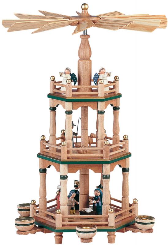 Die Pyramide wird in meisterhafter Handarbeit in der Traditionsmanufaktur KWO Olberhau hergestellt. Dargestellt wird auf 3 Etagen die Geburt Christi. Der Grundkörper der Pyramide ist aus ausgesuchten Naturhölzern geschaffen, die Figuren auf den Etagen sind in Handarbeit farbig gestaltet. Die Pyramide wird von 6 Kerzen angetrieben.