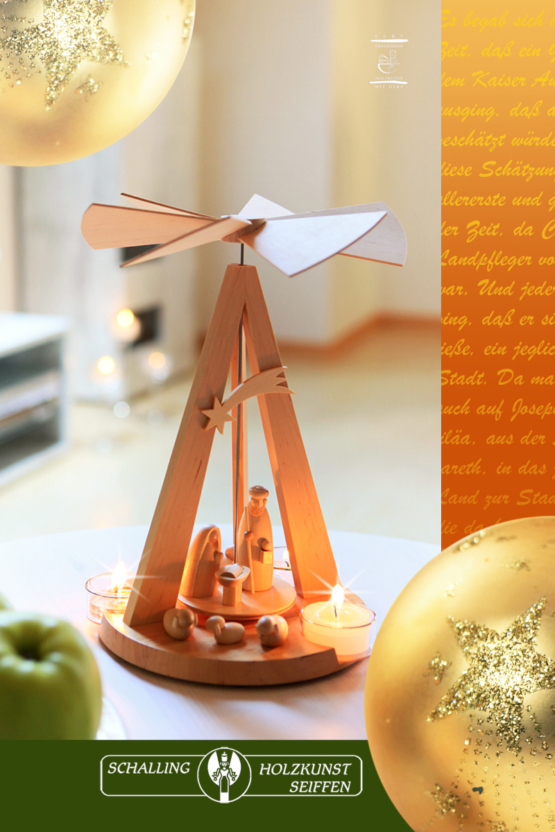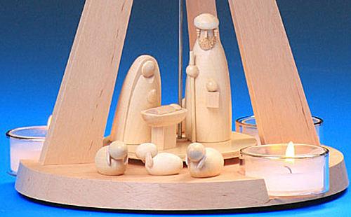 Das Gestell wird aus Erlenholz gefertigt, die Figuren sind aus Ahornholz gefertigt. Mit 3 Teelichtern
