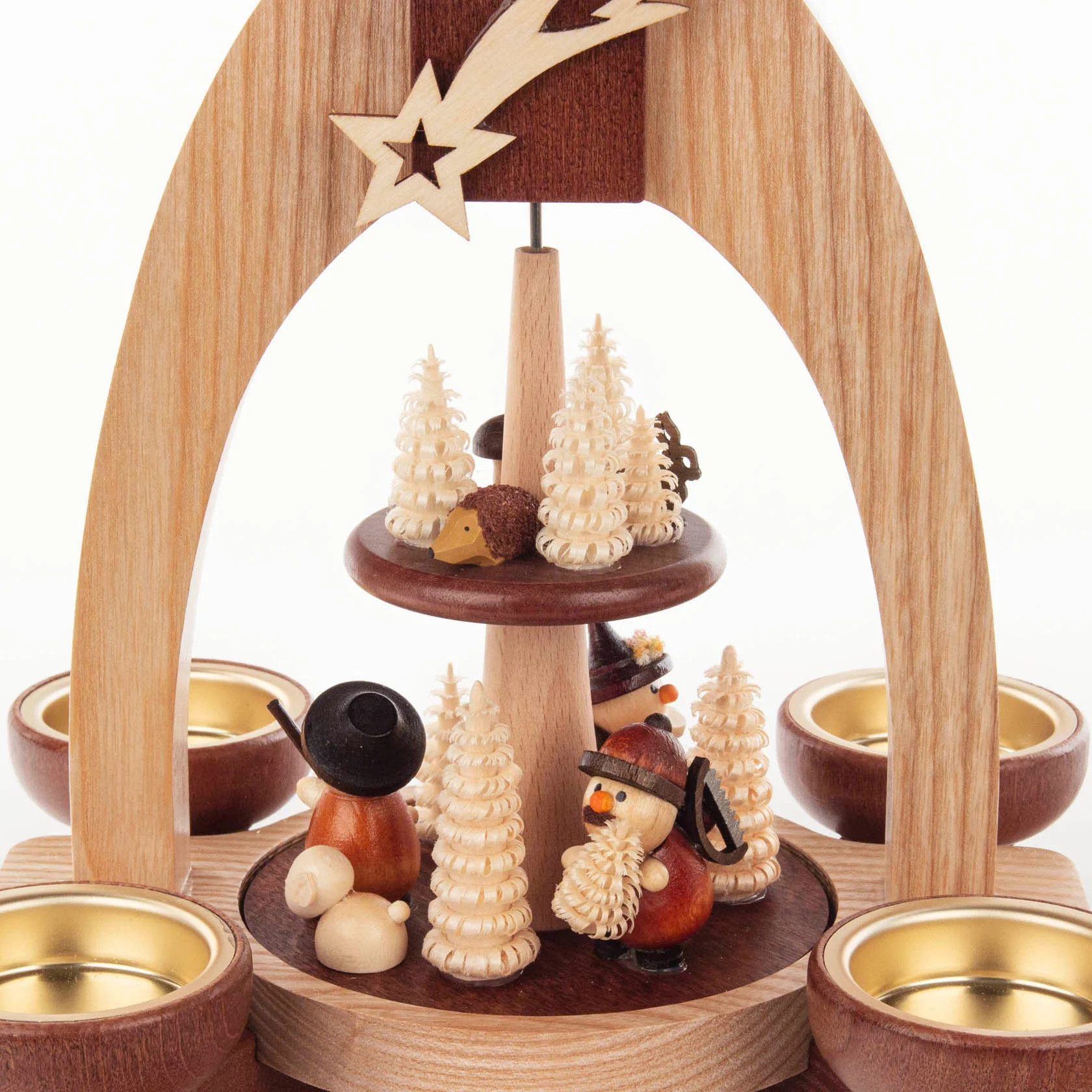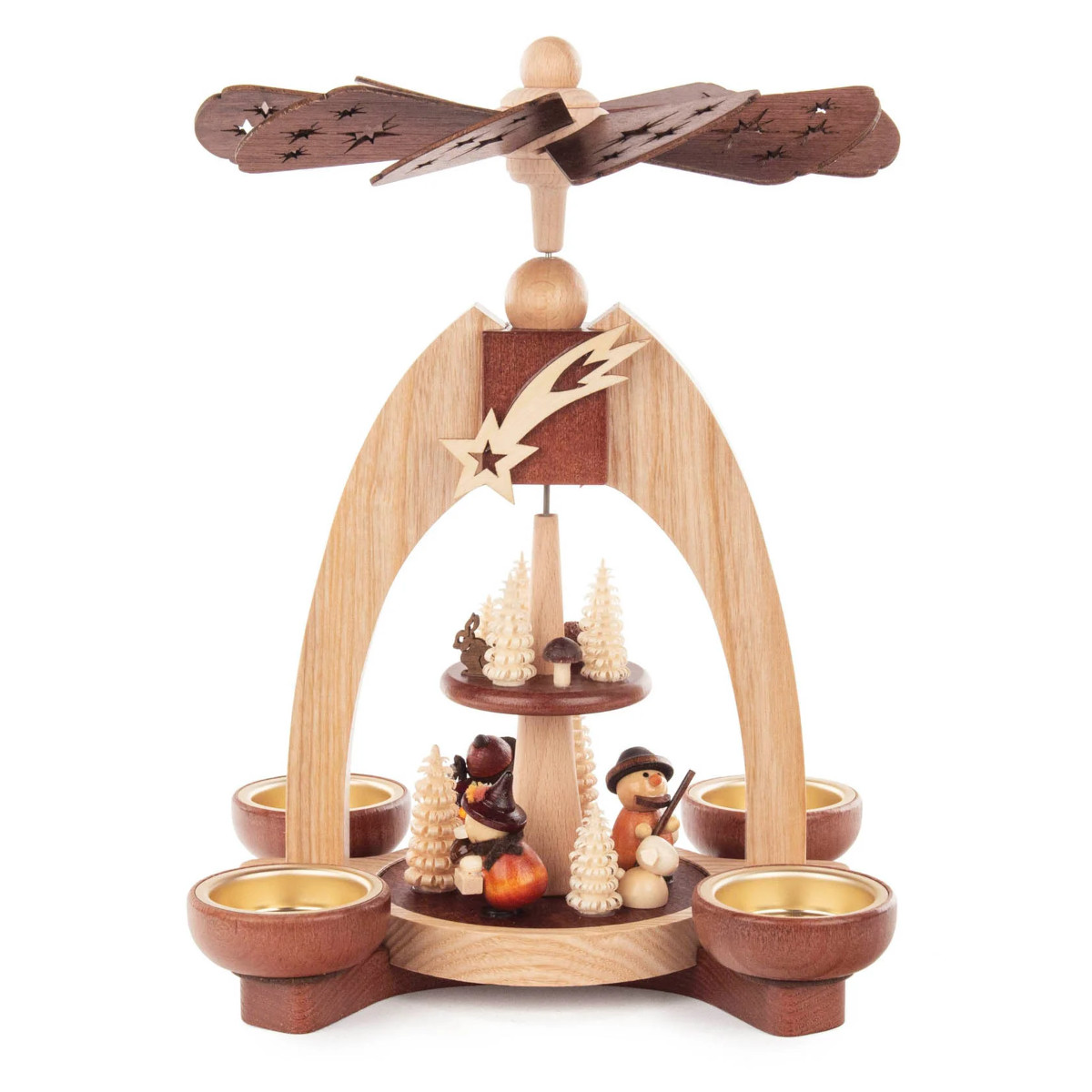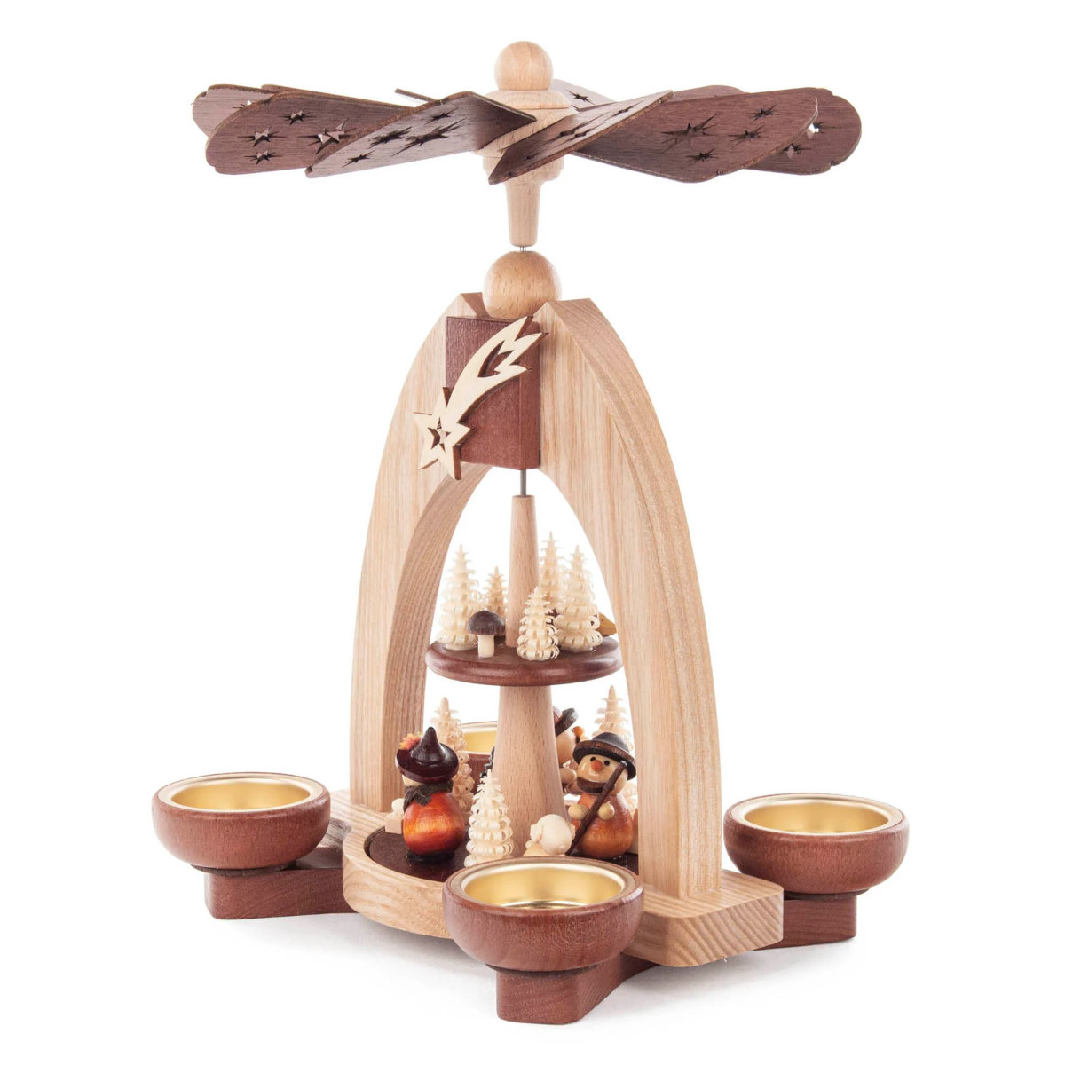 Die Pyramide ist 26 cm hoch. Besonders die Farbgestaltung mit den naturfarbenen Tönen und den dunkelbraunen Akzenten machen sie zu einem echten Highlight und Hingucker in jedem Raum. Die Pyramide besteht aus zwei Etagen, die große und kleine Laufscheibe zeigen Waldarbeiter, Schäfer, Pilzsucher, Igel, Hase und viele kleine Ringelbäumchen. Die Pyramide wird mit 4 Teelichten angetrieben.