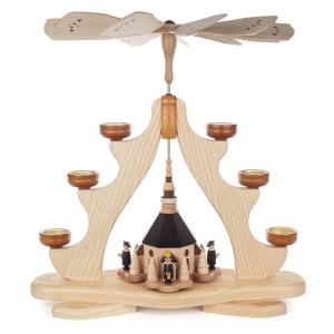 Diese Tischpyramide ist bestückt mit der Seiffener Kirche, Kurrendenfiguren,kleinen Bäumchen und 6 Teelichtern. Sie wird eingerahmt von einer Tanne aus edler Esche mit individueller Maserung.