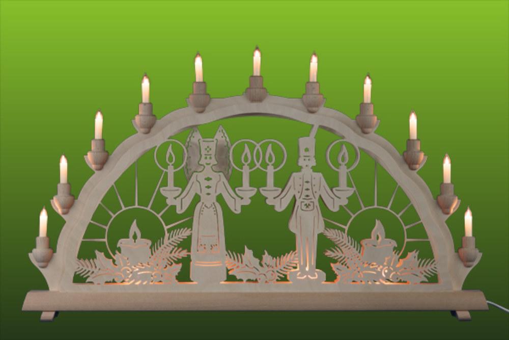 Dieser Schwibbogen besteht aus einem Grundmotiv und einem Vorsteckmotiv. Sichtbar sind 11 Kerzenlampen, die 4 Toplampen dienen zur Innenbeleuchtung. Dadurch entsteht ein wunderbar räumlicher 3D Effekt. In meisterhafter traditioneller handwerklicher Laubsägearbeit geschaffen, wird hier das traditionelle Erzgebirgsmotiv mit Engel und Bergmann dargestellt