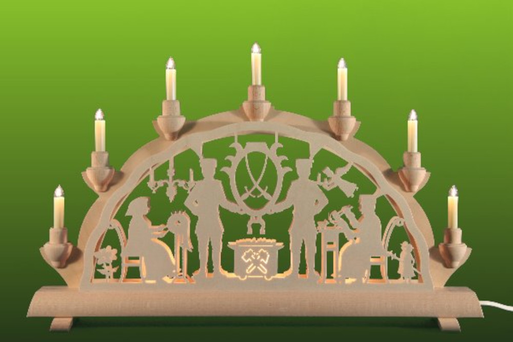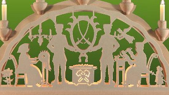 In meisterhafter traditioneller handwerklicher Laubsägearbeit geschaffen, wird hier das traditionelle Erzgebirgsmotiv mit 2 Bergleuten, einer Klöppelfrau und einem Schnitzer dargestellt.