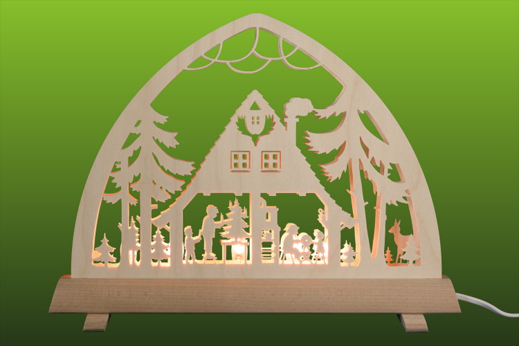 Dieser Leuchterbogen hat als Grundmotiv das bekannte Motiv aus einem Waldhaus aus dem Erzgebirge. Die Innenbeleuchtung am Unterteil des Bogens erzeugt einen wunderbaren 3D-Effekt.