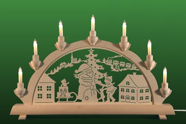 Dieser Schwibbogen besteht aus einem Grundmotiv,sichtbar sind 7 LED Kerzenlampen. In meisterhafter traditioneller handwerklicher Laubsägearbeit geschaffen, wird hier der Weihnachtsmann mit Kindern dargestellt.