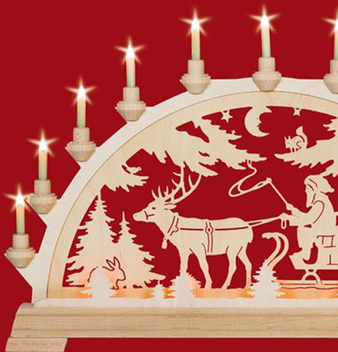 Dieser Schwibbogen besteht aus einem Grundmotiv,sichtbar sind 7 Kerzenlampen. Die Vorbeleuchtung mit 5 Toplampen leuchten hinter einem kleinen Zaun mit Bäumchen und erzeugen einen räumlichen Effekt. In meisterhafter traditioneller handwerklicher Laubsägearbeit geschaffen, wird hier der Nikolaus auf seiner Fahrt mit dem beladenen Schlitten durch den Winterwald dargestellt .