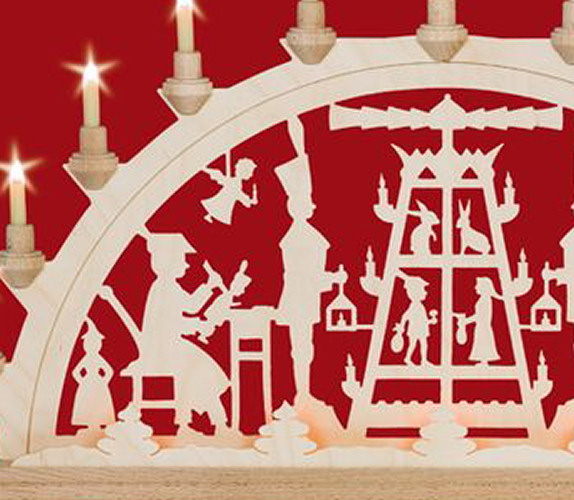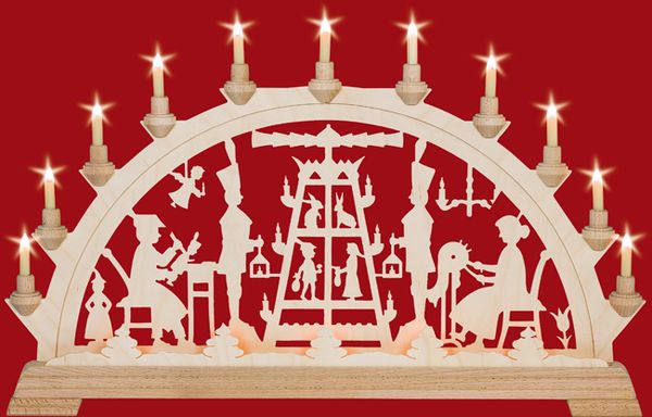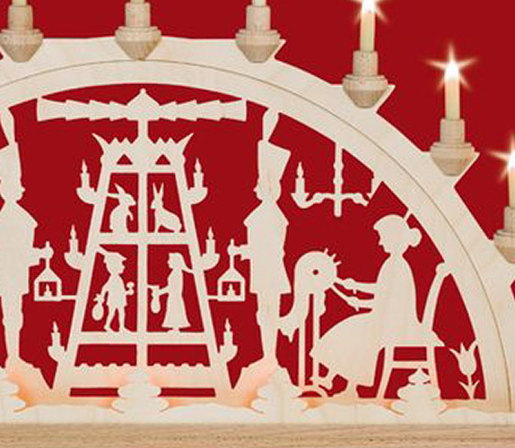 Dieser Schwibbogen besteht aus einem Grundmotiv,sichtbar sind 11 Kerzenlampen. Die Vorbeleuchtung mit 5 Toplampen leuchten hinter einem kleinen Zaun mit Bäumchen und erzeugen einen räumlichen Effekt. In meisterhafter traditioneller handwerklicher Laubsägearbeit geschaffen, werden hier die traditionellen Handarbeiten des Erzgebirges dargestellt.