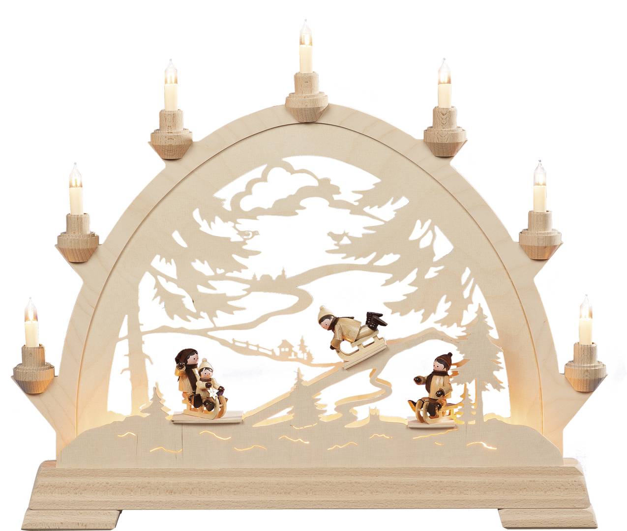 Dieser Rundbogen ist bestückt mit gedrechselten Figuren Kinder beim Rodeln. D er untere Teil des Rundbogens ist hinterleuchtet und erscheint in einem wunderbaren 3D-Effekt.