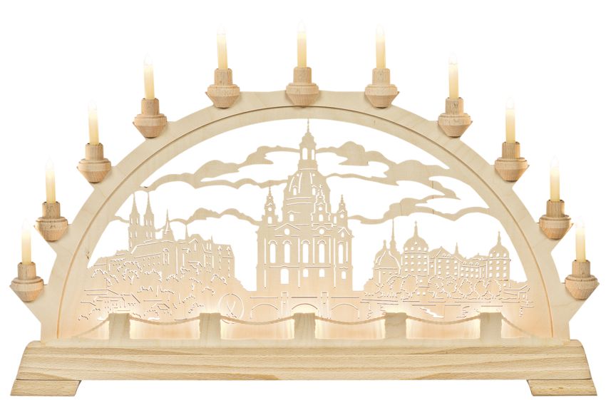 Dieser Schwibbogen besteht aus einem Grundmotiv,sichtbar sind 11 Kerzenlampen. Die Vorbeleuchtung mit 5 Toplampen leuchten hinter dem Zaun im Vordergrund und erzeugen einen räumlichen Effekt. In meisterhafter traditioneller handwerklicher Laubsägearbeit geschaffen, werden hier die bekannten Sehenswürdigkeiten Sachsens Dresdner Frauenkirche, Schloß Moritzburg und der Meißner Dom dargestellt.