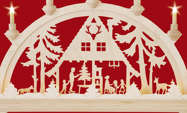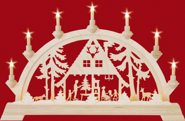 Dieser Schwibbogen besteht aus einem Grundmotiv,sichtbar sind 7 Kerzenlampen. Die Vorbeleuchtung mit 5 Toplampen leuchten hinter einem kleinen Zaun mit Bäumchen und erzeugen einen räumlichen Effekt. In meisterhafter traditioneller handwerklicher Laubsägearbeit geschaffen, werden hier die Bewohner eines erzgebirgischen Waldhauses bei der traditionellen Heimarbeit vor Weihnachten dargestellt.