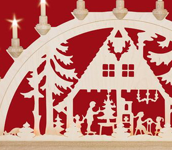 Dieser Schwibbogen besteht aus einem Grundmotiv,sichtbar sind 11 Kerzenlampen. Die Vorbeleuchtung mit 5 Toplampen leuchten hinter einem kleinen Zaun mit Bäumchen und erzeugen einen räumlichen Effekt. In meisterhafter traditioneller handwerklicher Laubsägearbeit geschaffen, werden hier die Bewohner eines erzgebirgischen Waldhauses bei der traditionellen Heimarbeit vor Weihnachten dargestellt.