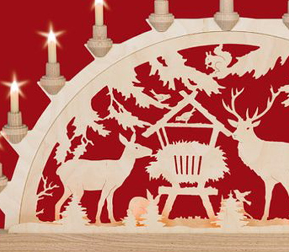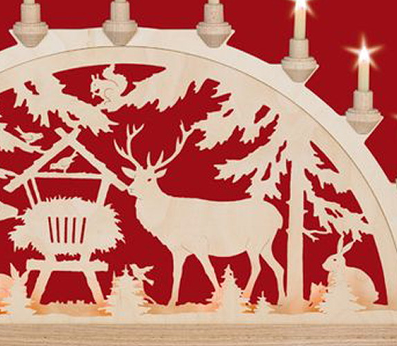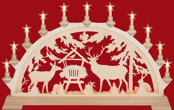 Dieser Schwibbogen besteht aus einem Grundmotiv,sichtbar sind 11 Kerzenlampen. Die Vorbeleuchtung mit 5 Toplampen leuchten hinter einem kleinen Zaun mit Bäumchen und erzeugen einen räumlichen Effekt. In meisterhafter traditioneller handwerklicher Laubsägearbeit geschaffen, werden hier Tiere des Waldes an der Futterkrippe dargestellt .