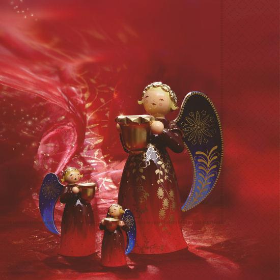 Stilvoller Tischschmuck. Mit zwei neuen Motiven setzt Wendt & Kühn die Servietten-Edition fort. Für die Bildmotive wurden die Figuren stimmungsvoll in Szene gesetzt:Vor elegantem Rot entfaltet sich die himmliche Pracht der reich bemalten Engel.